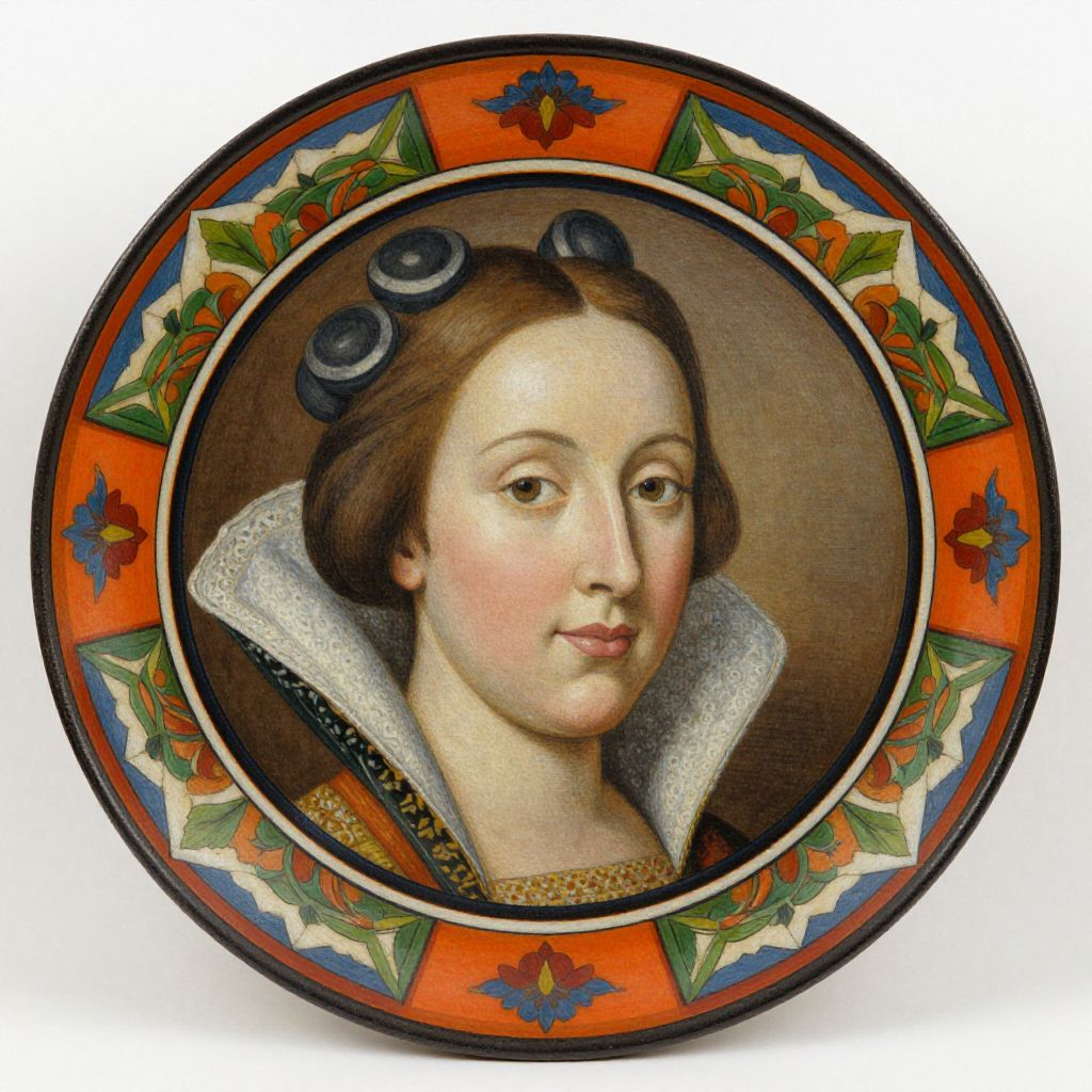 Circular platter featuring a painted Elizabethan-style portrait of a woman's face, surrounded by a vibrant border of geometric patterns and floral motifs in shades of orange, green, blue, and red.