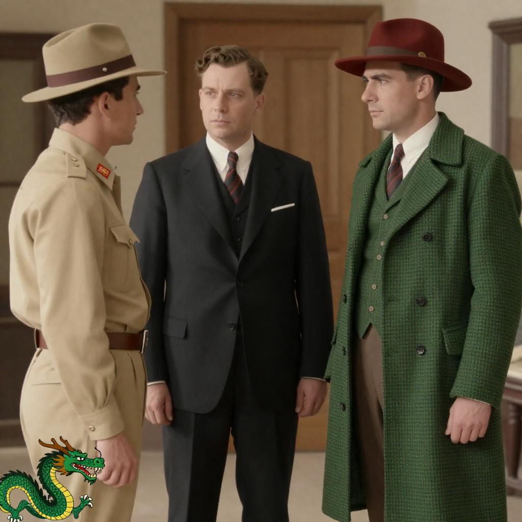 Four people in a 1930s-style illustration. Two men in beige safari uniforms with hats, one in a dark suit, one in a green checkered coat with a red hat. The man in the suit stands center, facing left. The man in the green coat stands right, facing forward. The two men in safari uniforms face each other. The background is wooden panels. The man in the suit has a neutral expression, the man in the green coat has a serious expression. A green dragon illustration is in the bottom left corner.