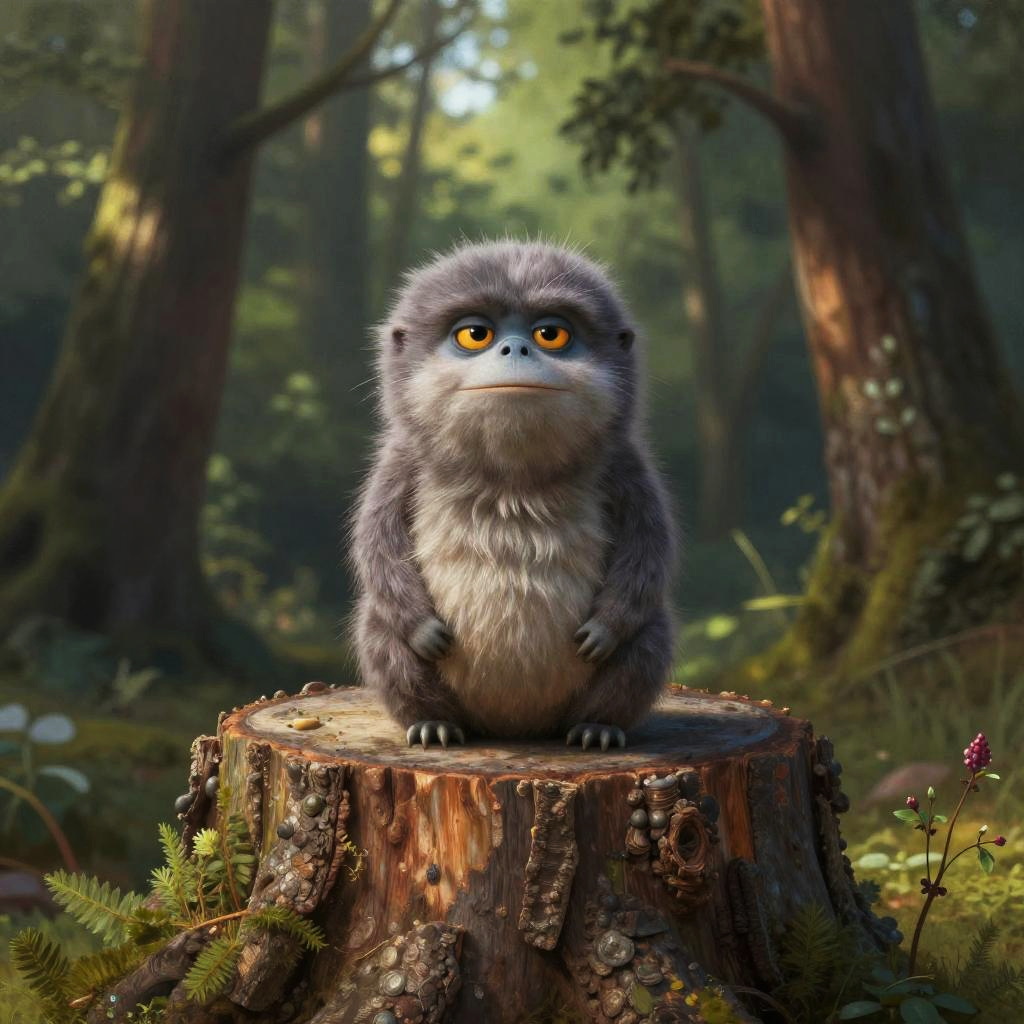 Lorax on tree stump, hyper-realistic digital painting, intricate bark and fur details, soft natural light filtering through trees, serene and peaceful ambiance