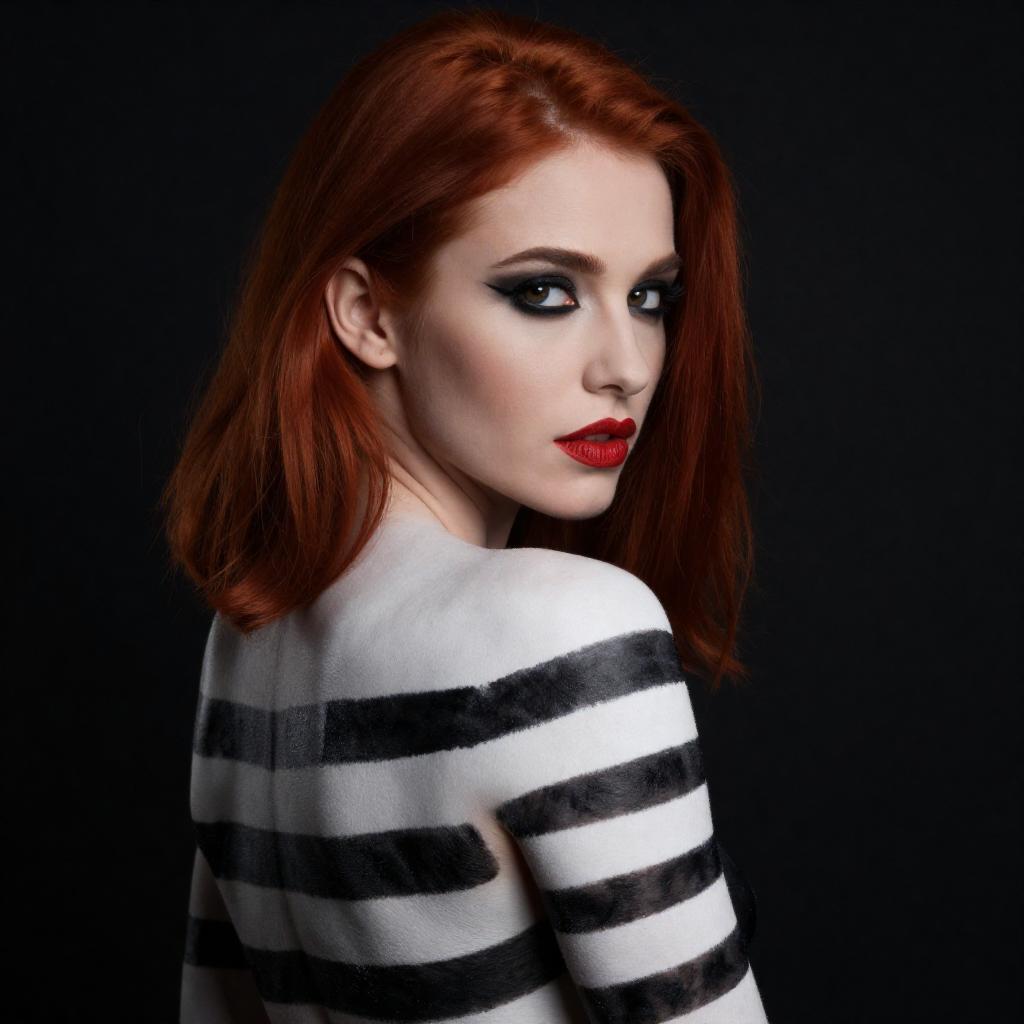 Photograph of a woman with vibrant red, shoulder-length hair, pale skin, and intense gaze. She has bold black eyeliner, red lipstick, and black-and-white striped body paint covering her shoulders and arms. She looks over her right shoulder against a black background.