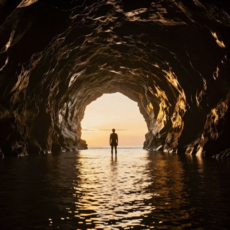 A solitary figure stands at the entrance of a vast, cavernous tunnel, its rugged walls illuminated by the warm glow of a setting sun that spills through the distant opening, casting golden reflections on the rippling, liquid-like surface beneath.