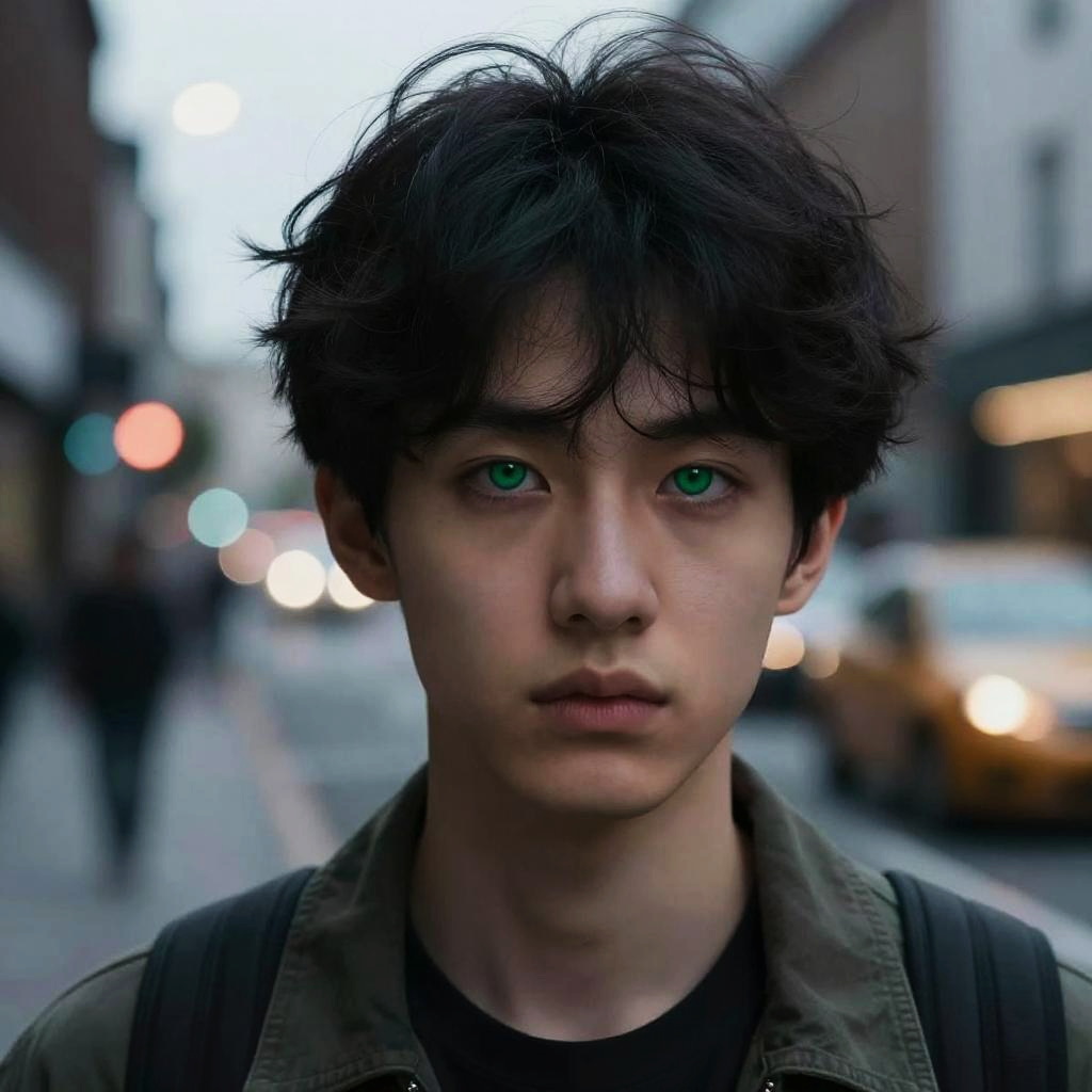 Pale skin black hair green eyes young man with a pensive expression, urban street style clothing, evening city lights blurred in the background, cool color palette with a focus on sharp facial features and reflective green eyes.