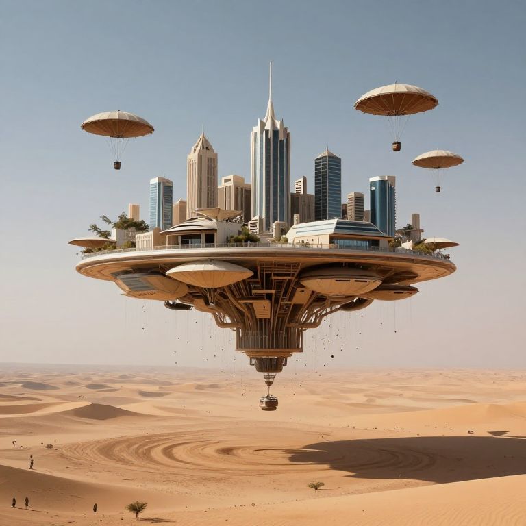 A CGI image depicts a futuristic, floating cityscape hovering above a desert landscape. The city features modern skyscrapers with sleek, glass facades and a central, spire-like tower. Suspended beneath the city are large, circular, umbrella-like structures. Four smaller, parachute-like objects float above the city. The desert below has sandy dunes with scattered palm trees and small human figures. The sky is clear and blue, enhancing the contrast with the desert's orange hues. The overall style is highly realistic with a blend of futuristic and utopian elements.