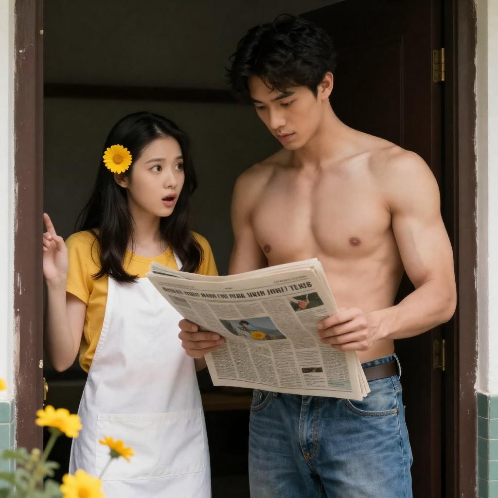 Photograph of a group of muscular men in white trunks, standing and leaning around a smiling woman in a light dress. The men have defined abs and are variously smiling or looking at each other. The woman is centered, surrounded by the men. They are on a grassy area with wooden benches in the background.