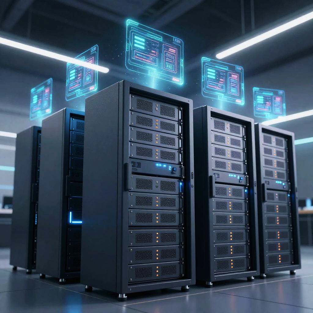 Vm virtualization concept art, servers stacked in a glowing data center, virtual machines represented as floating holograms above racks, ambient cool lighting, high-tech modern style, ultra-realistic rendering with depth and shadows