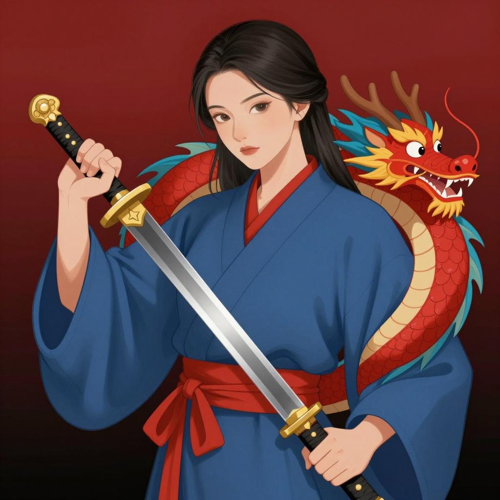 Digital illustration of an Asian woman with black hair, blue robe, and red sash, holding a golden-hilted sword. Red dragon with yellow and blue accents wraps around her arm. Red and black background. Woman's expression is calm. Dragon's expression is playful.