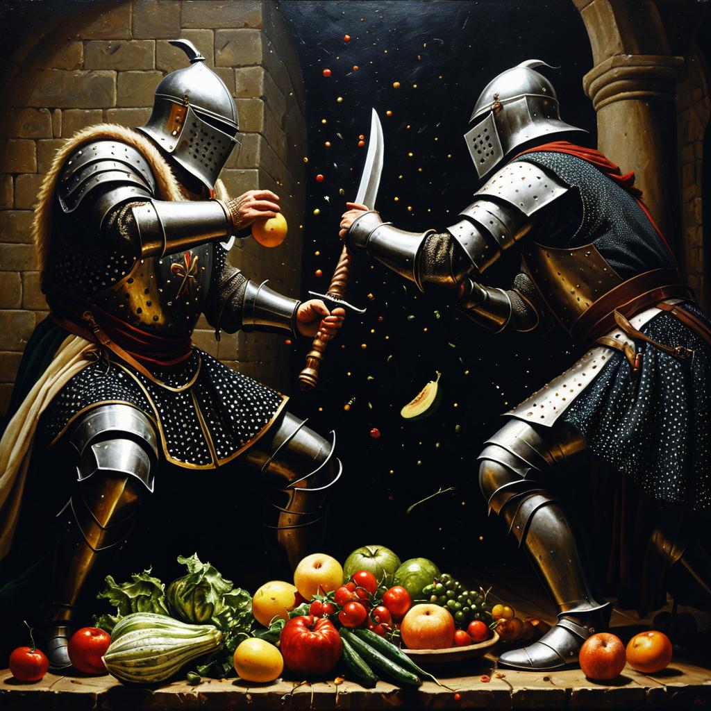Benday Dots Create a dynamic, ultra-realistic oil painting on canvas, depicting a medieval battle between anthropomorphized fruits and vegetables, by capturing action, emotion, chiaroscuro lighting, and detailed textures within a fitting environment.,