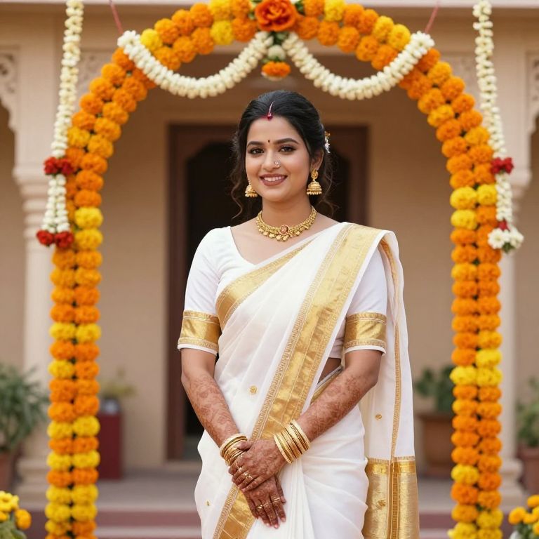 A wedding ceremony setting in a traditional Rajasthani-style compound, a well-dressed young bride in a white saree with a bold golden border, standing under a marigold and jasmine-covered archway, her face glowing with joy and confidence, wearing a pair of gold earrings and a light makeup accent
