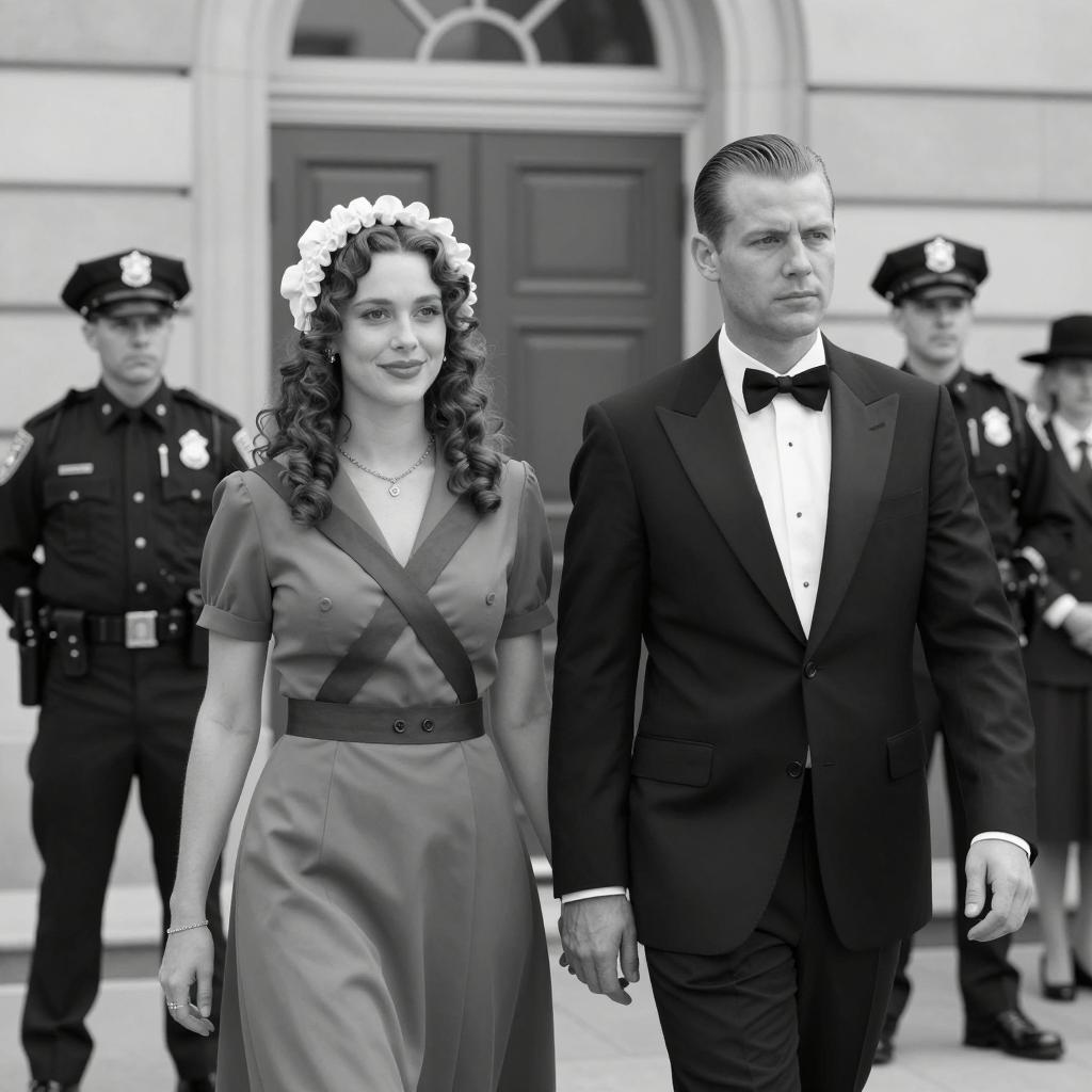 Black and white photograph. Two women with wavy, curled hair face each other, engaged in conversation. Both wear off-the-shoulder dresses; one has a pearl necklace. Background includes a man in a tuxedo and a child with short, curly hair. The man looks forward, and the child looks to the left. The scene takes place in a vehicle with patterned curtains. The man's expression is neutral.