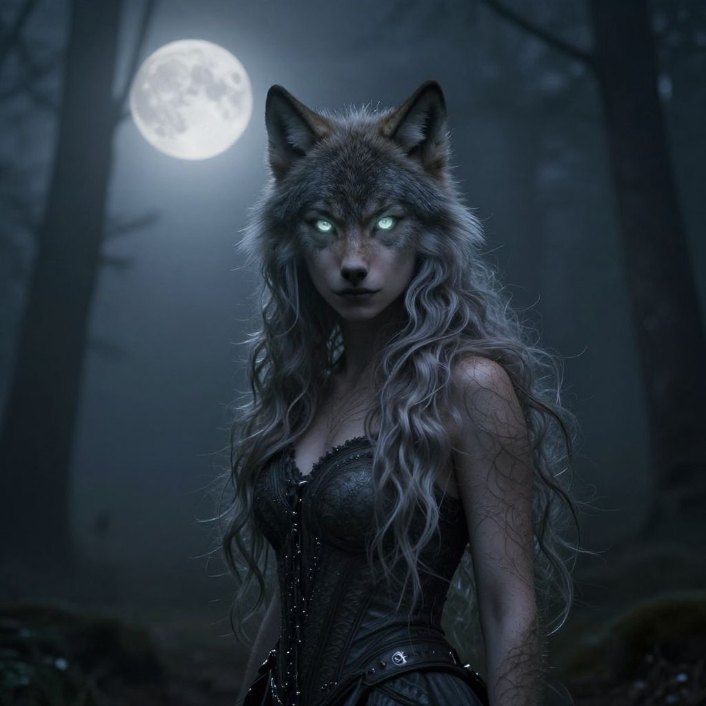 Wolf woman of Mobile, enchanted guardian with glowing blue eyes and wolf mask, ancient ruins covered in moss and vines, magical aura surrounding her, detailed fantasy style