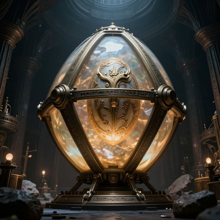 The image presents a low-angle view of an enormous Mana battery, an opalescent icosahedron stone encased in a mechanical frame with intricate runic designs. The 500 lb. Faberge egg, crafted in a draconic style, is positioned at the center of the icosahedron, casting a warm glow. The scene is set in the middle of an underground temple, reminiscent of a wizard's lab or an Artificer's workshop, with a Tesla Experimental Station deep underground. The surrounding environment is dark, with scattered rocks and debris, adding to the mysterious and ancient atmosphere. The mechanical giant, a low-angle shot of the icosahedron mechanical giant, looms in the background, hinting at the grandeur and complexity of the structure.