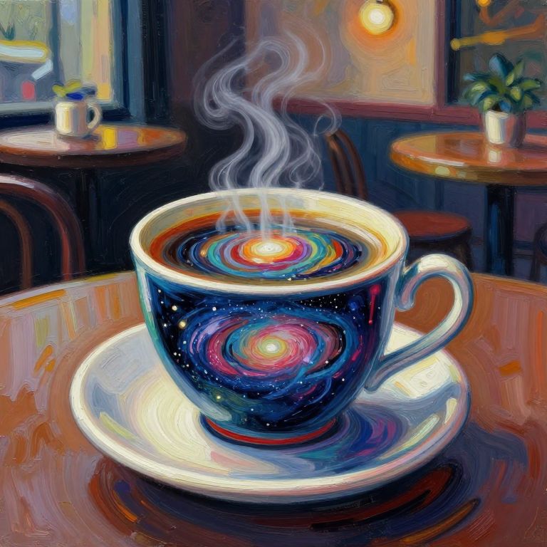 A stylized post-impressionism painting of a steaming coffee cup with swirling galaxies depicted inside the cup and on its surface, placed on a saucer on a wooden table. The background shows a softly lit cozy café interior with additional tables and small plants. The artwork blends digital and traditional acrylic/oil pastel textures.