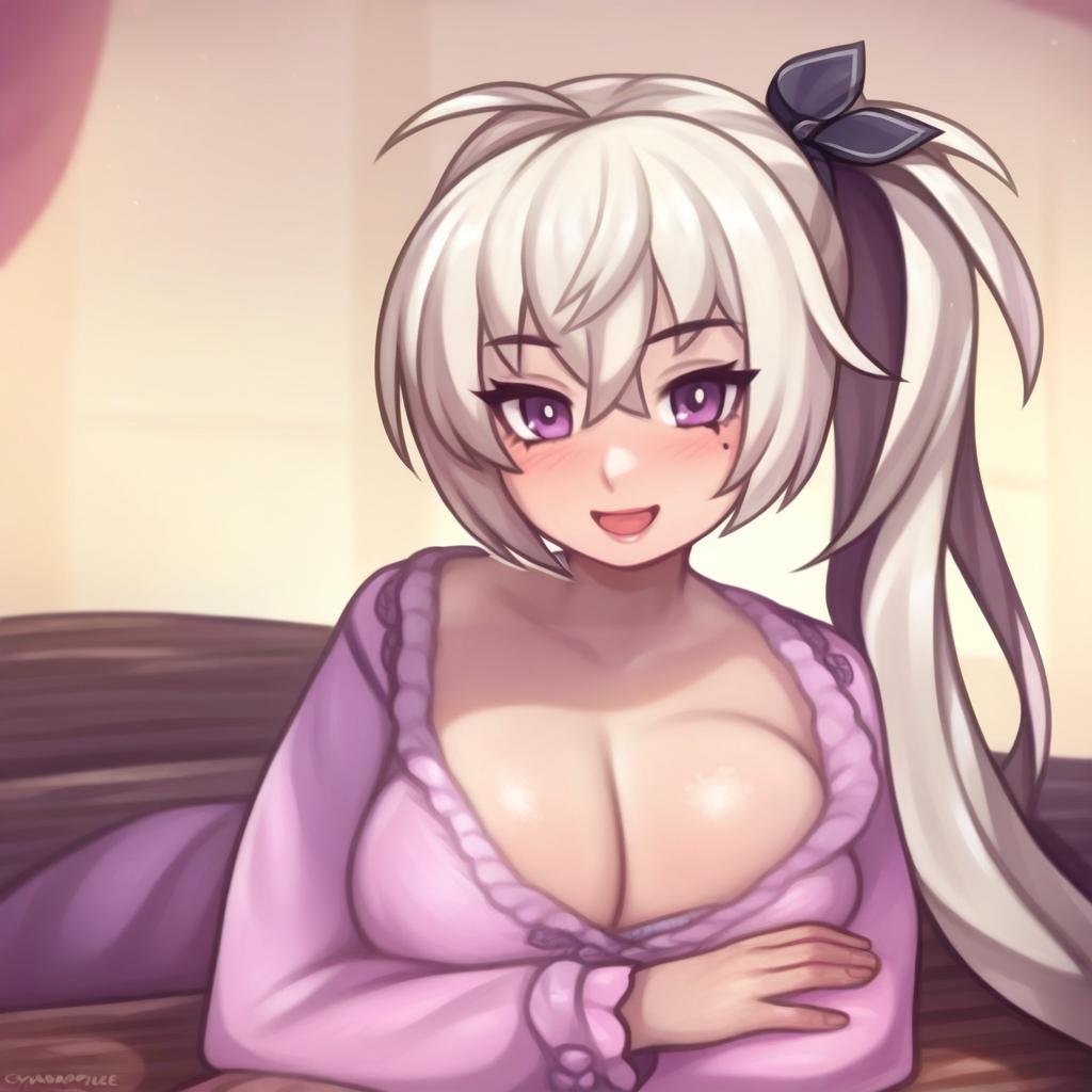 Digital illustration of an anime-style young woman with long white hair tied in a side ponytail with a dark ribbon. She has purple eyes, visible eyelashes, and light blush on her cheeks. She wears a low-cut purple dress with long sleeves, revealing her collarbone and cleavage. The character is posed leaning forward with arms crossed on a surface, set against a softly lit background.