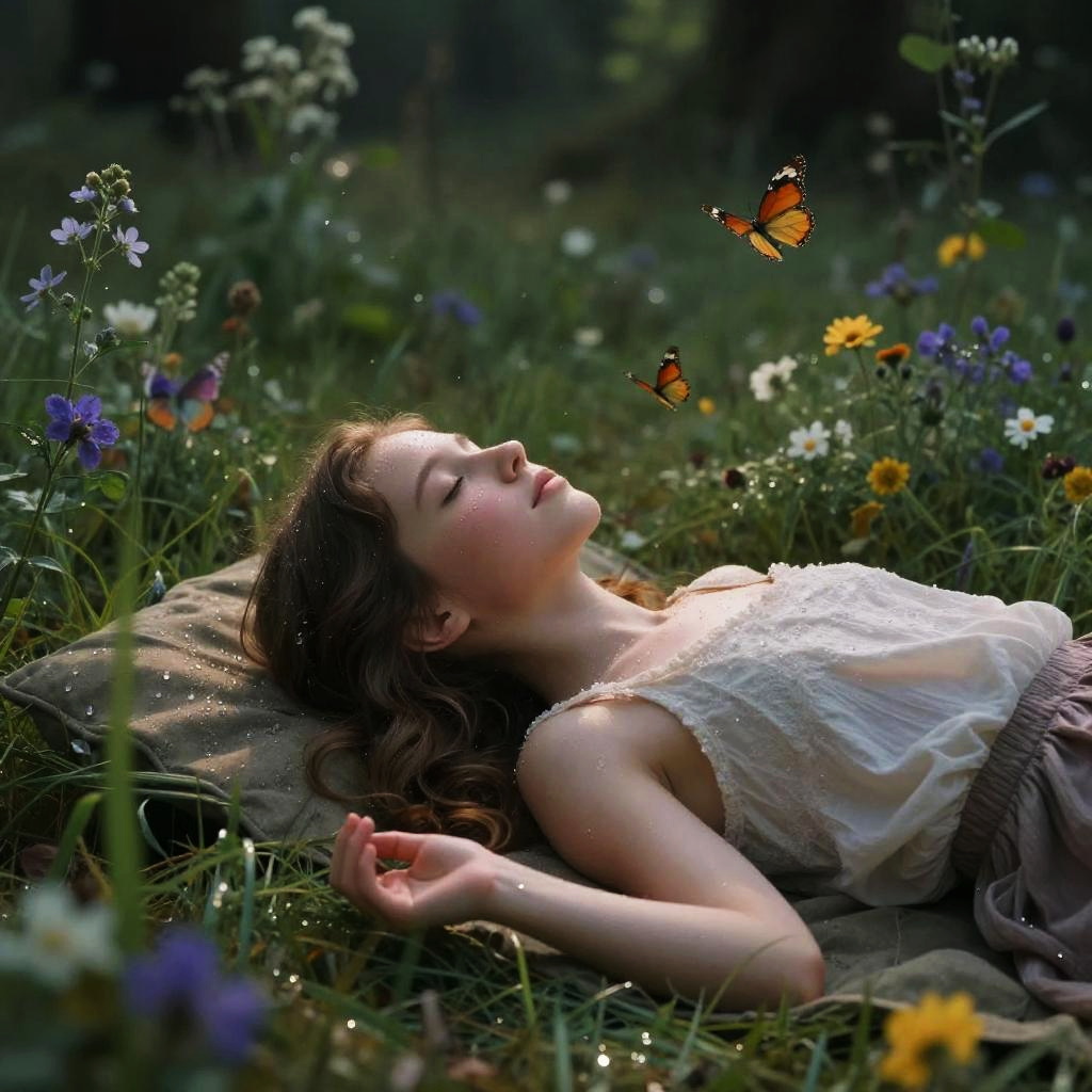 One young girl laying flat on a bed meditating and imagining a fairy tale meadow with sparkling dew drops, wildflowers, and fluttering butterflies, the scene looks spiritual, dreamy, and magical, with a cinematic ultra-realistic rendering in 8k, dramatic lighting, extreme detail.