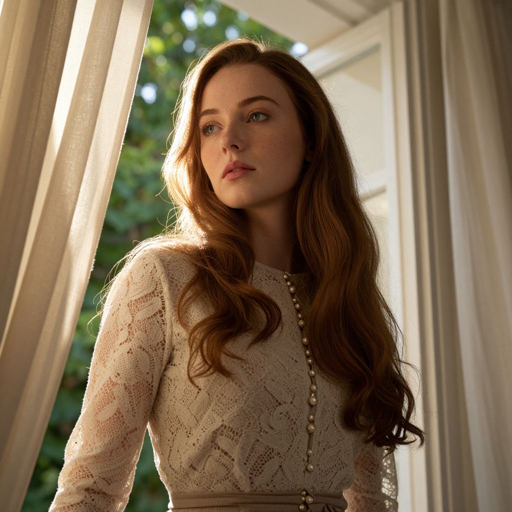 Envision a captivating portrait of a Caucasian woman with cascading chestnut-brown hair framing her delicate features and high cheekbones. The interplay of natural sunlight through sheer curtains casts a warm glow on her fair skin, accentuating the subtle freckles across her nose and cheeks. From an unusual low angle, she gazes towards the horizon, standing by an open window that reveals lush greenery in the soft background light. This ultra-realistic portrait captures her introspective mood while showcasing intricate details of a lace blouse adorned with pearl buttons and a cinched waist, exuding elegance and vulnerability.