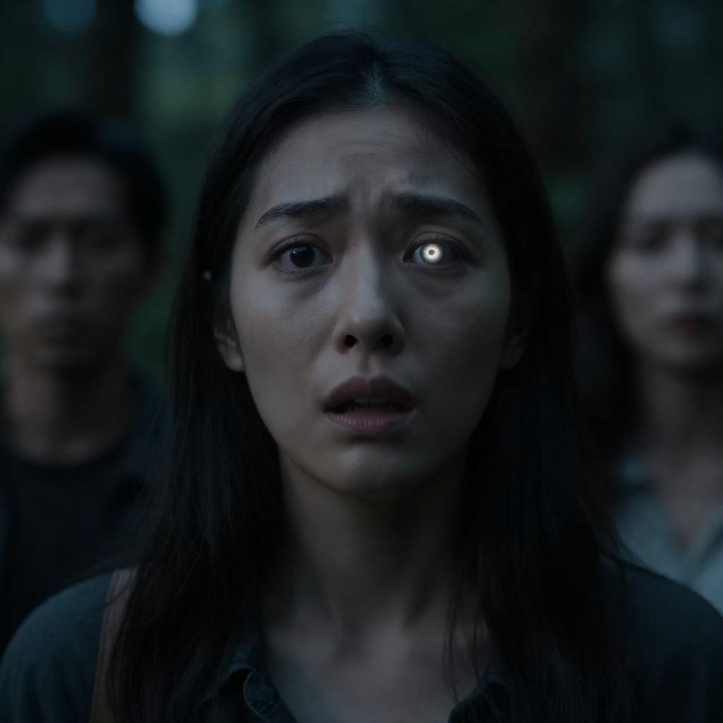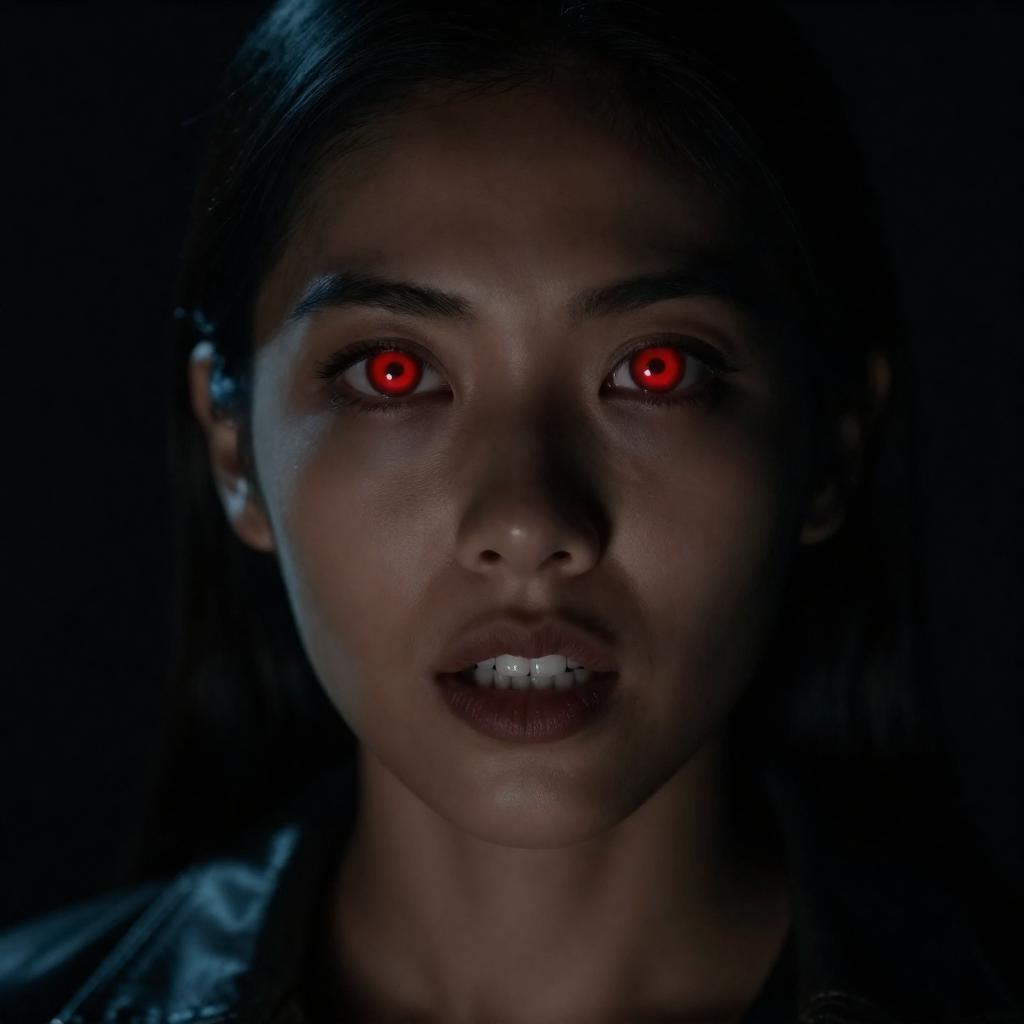 Close-up portrait of an Asian woman with dark skin and dark hair wearing a dark jacket. Her eyes glow red with an intense gaze, and her slightly open mouth reveals sharp teeth. The background is black, emphasizing the dramatic lighting and shadowed face.