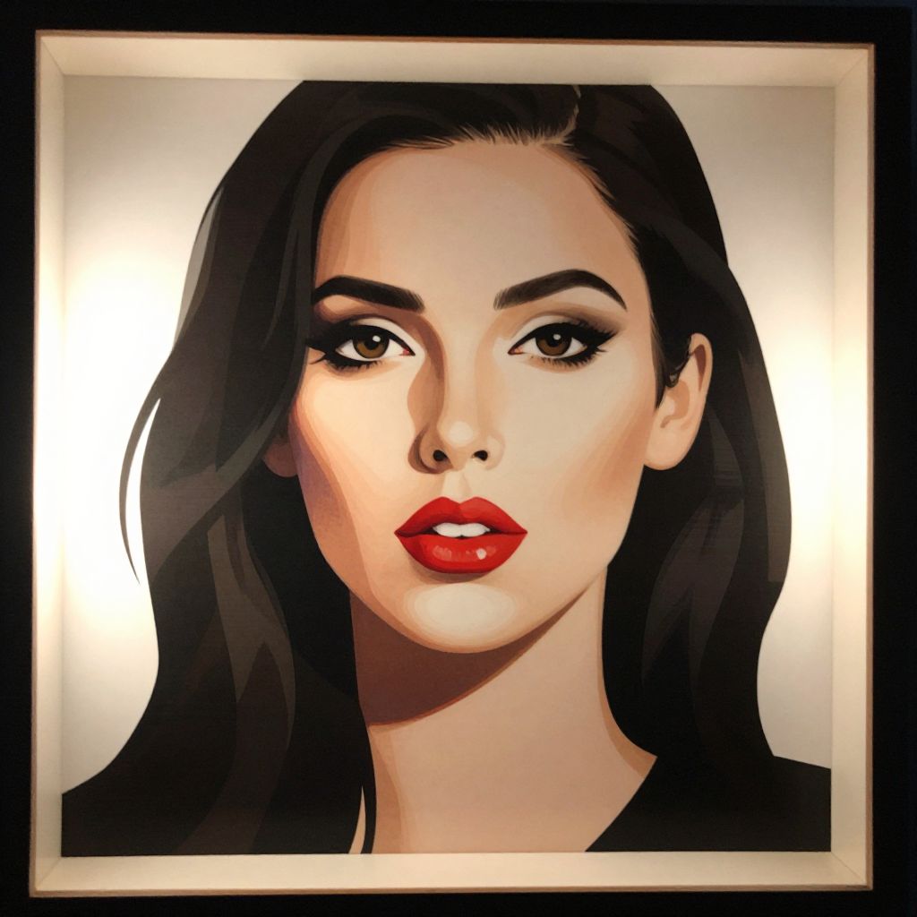 A stylized vector art portrait of a woman with bold features and vibrant red lips, framed in a light box with dramatic backlighting, evoking a modern and striking visual effect.