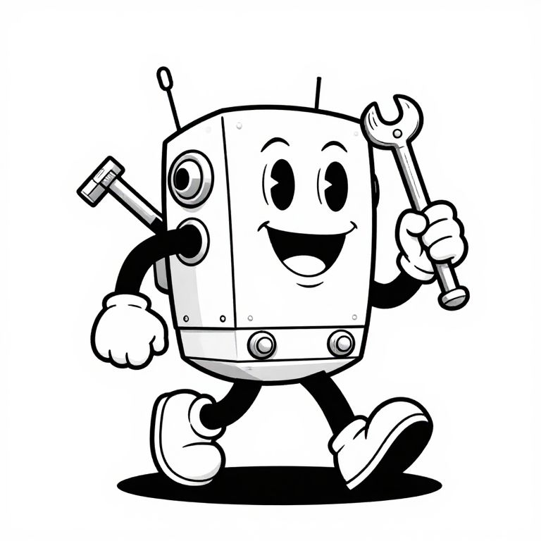 Soft retro vintage cartoon mechanic mascot running with tools, line art, vector image, white background,