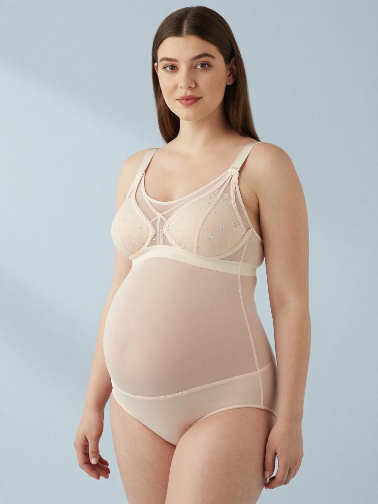Plus-size pregnant woman with straight mid-length brown hair wearing an ivory mesh maternity bra with embroidered details and full-coverage bottoms. She stands against a powder blue minimal studio backdrop in soft natural light, showcasing high-end maternity lingerie with soft curves and a radiant expression.