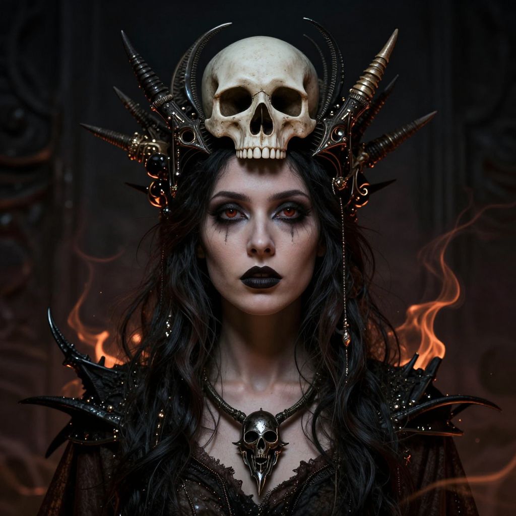 A woman with a skull crown, surrounded by intricate, dark, and fiery details, evoking a sense of the macabre and the supernatural.