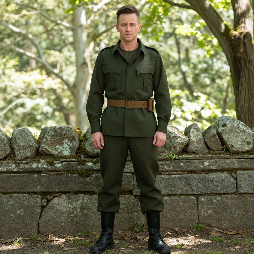 Photograph of a handsome man with short brown hair, wearing a green military-style jacket, white shirt, black pants, and boots, standing on a