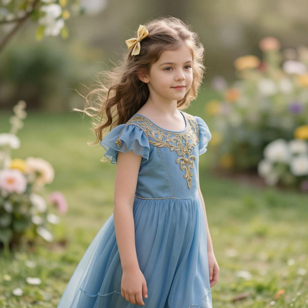 A beautiful young girl with soft brown hair flowing gently over her shoulders, wearing a elegant blue dress with intricate gold embroidery along the shoulders and a delicate gold bow pinned elegantly on her head. The dress has a flowing silhouette and subtle ruffles, giving it a timeless, fairy-tale charm. She stands in a sunlit garden with blooming flowers and soft green grass, her expression calm and joyful, as if caught in a moment of quiet wonder.