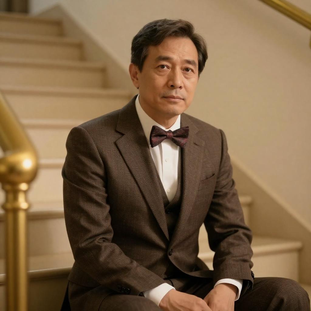 Middle-aged man in black suit and striped tie, standing in office hallway. Office with fluorescent lights, desks, filing cabinets, and blue chairs. Another person partially visible in background. Man's expression is serious, looking slightly to the right. Ceiling clock in background.
