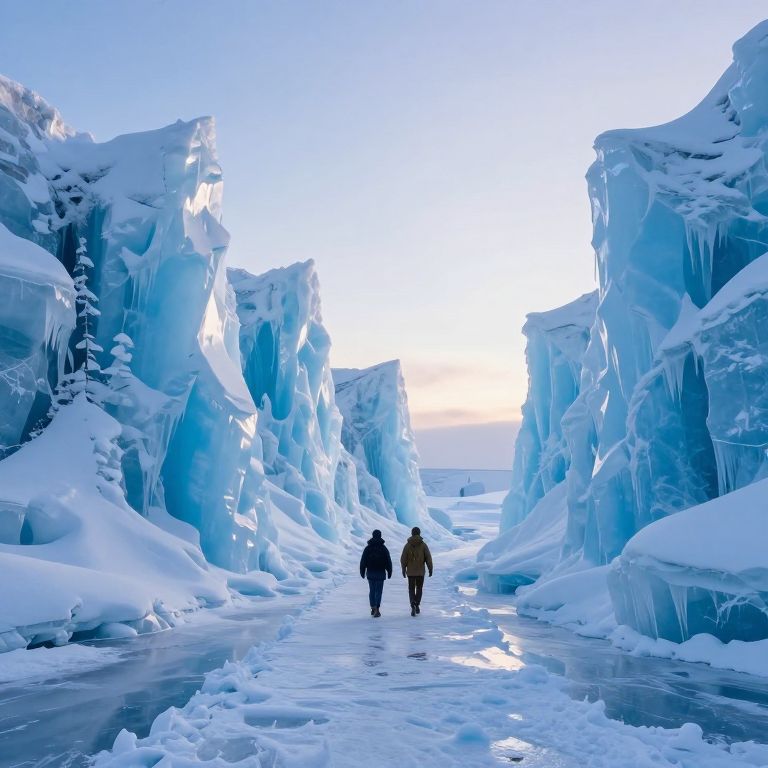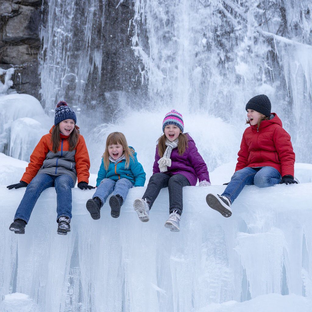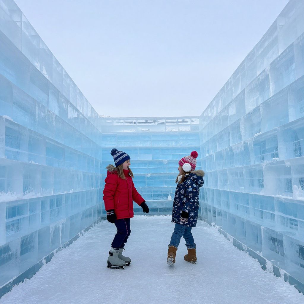 Two children joyfully interact on a frozen ice formation, their laughter echoing against the translucent blue walls of a sculpted ice maze, as they explore the icy landscape beneath a winter sky.