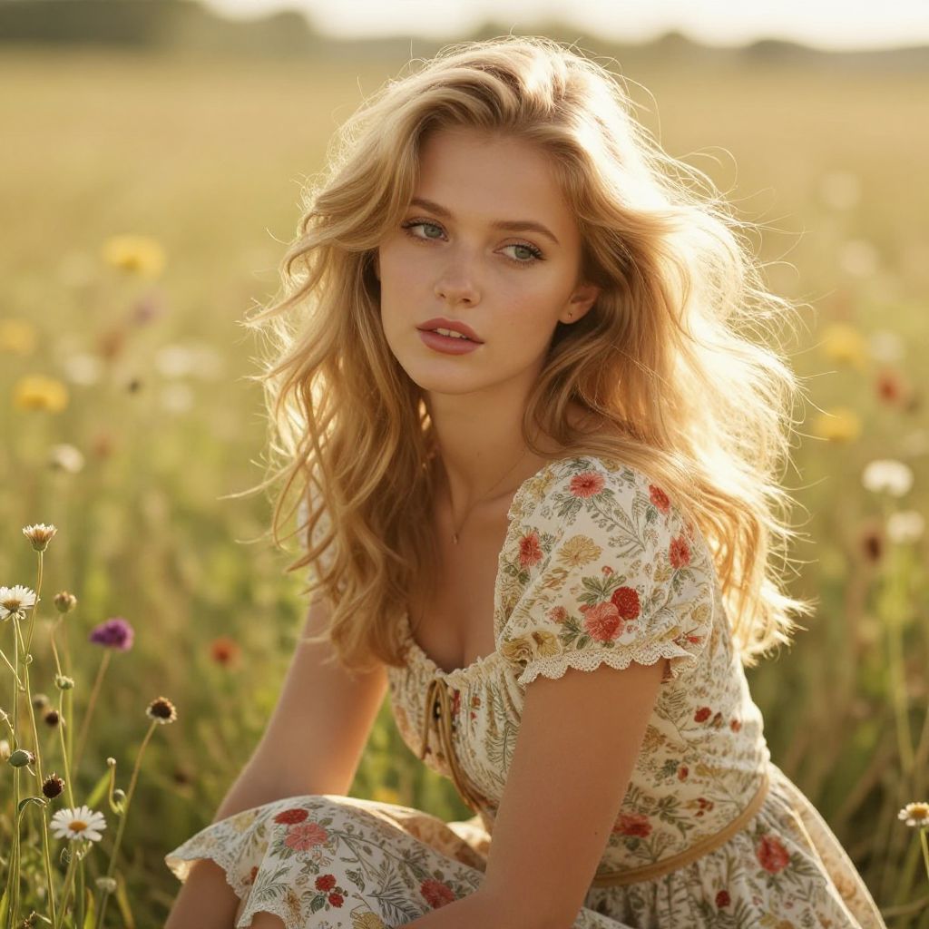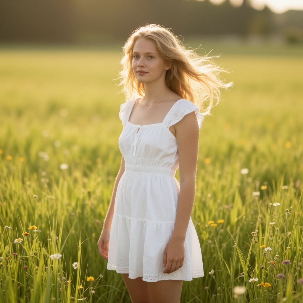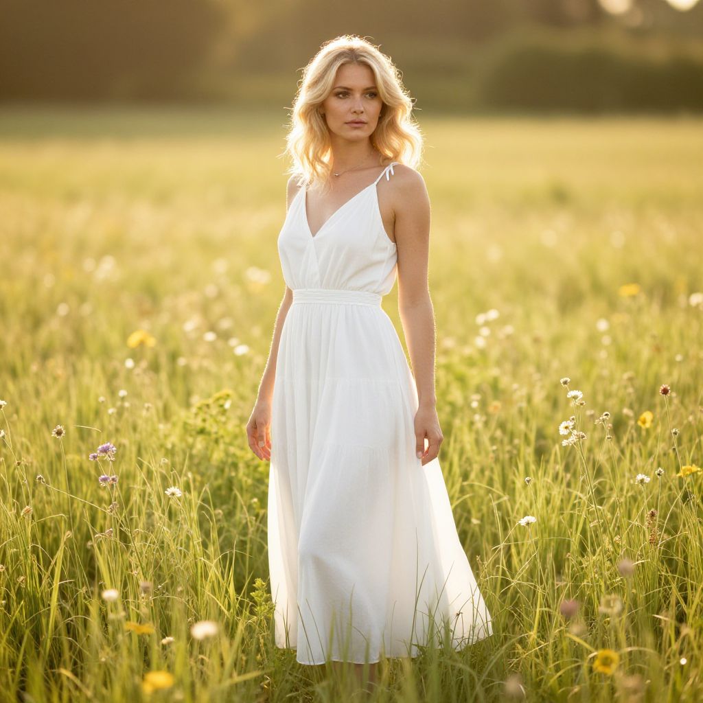 Happy blonde woman smiling brightly in a sunlit meadow, surrounded by wildflowers and butterflies, soft golden hour lighting, vibrant colors, casual summer dress flowing in the gentle breeze, joyful and carefree atmosphere, detailed facial features, natural beauty