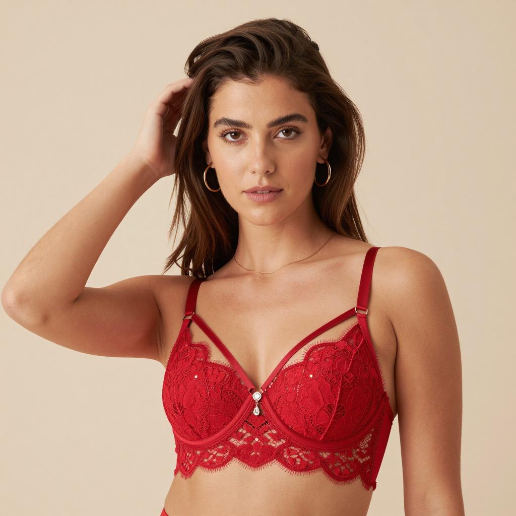 Photograph of a woman with long brown hair, wearing a red lace bra with strappy details and a central charm. She has light skin, brown eyes, and wears gold hoop earrings and a delicate necklace. She stands against a plain beige background, looking directly at the camera with a neutral expression. Her right hand is raised to her head, touching her hair.