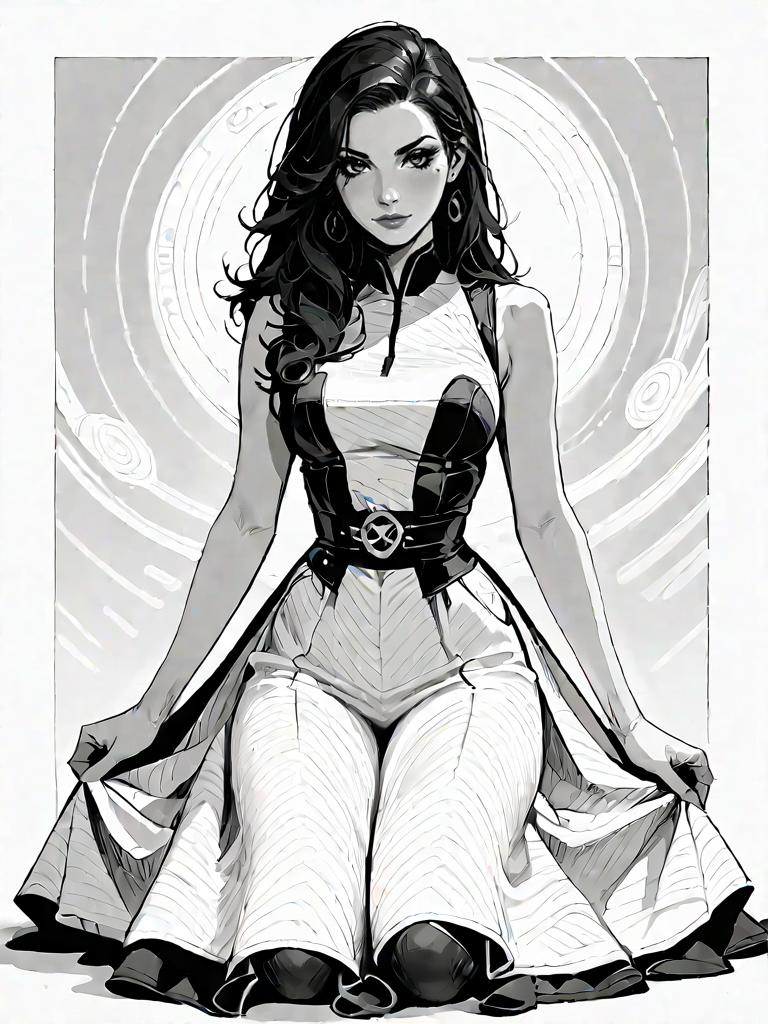 Digital black and white illustration of a realistic woman kneeling, wearing a monochrome bodycon dress with an abstract black and white print. The sleeveless dress features a deep v-neckline, knee-length cut with a central slit, and is paired with black strappy high heels. The woman has long dark hair, expressive eyes, and wears hoop earrings while holding the sides of her dress. The background includes abstract circular patterns.