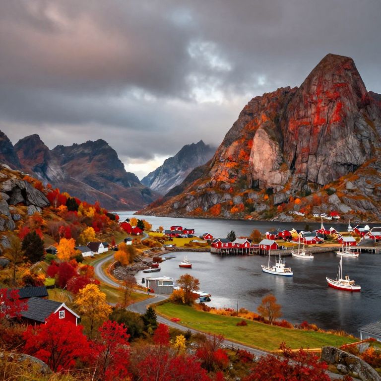 Lofoten landscapes during autumn, fiery red and gold foliage covering the valleys, winding river flowing through farmland, traditional Norwegian fishing boats in the harbor, dramatic cloudy sky, painterly style with rich textures and deep contrast, enchanting rural scene