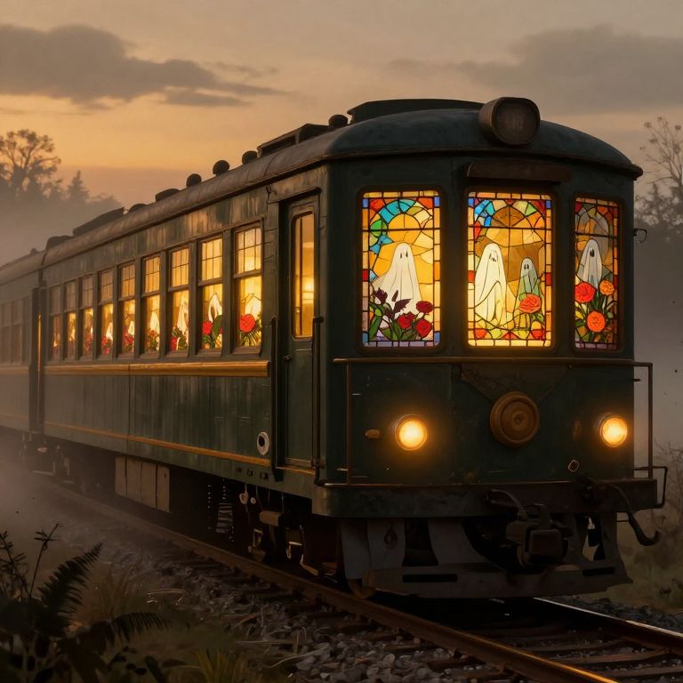 A hauntingly atmospheric digital illustration depicts a vintage train adorned with stained-glass windows, each glowing warmly with ghostly figures and vibrant floral arrangements, symbolizing diverse emotional memories as it glides through a misty, moody landscape under dramatic golden-hour lighting.