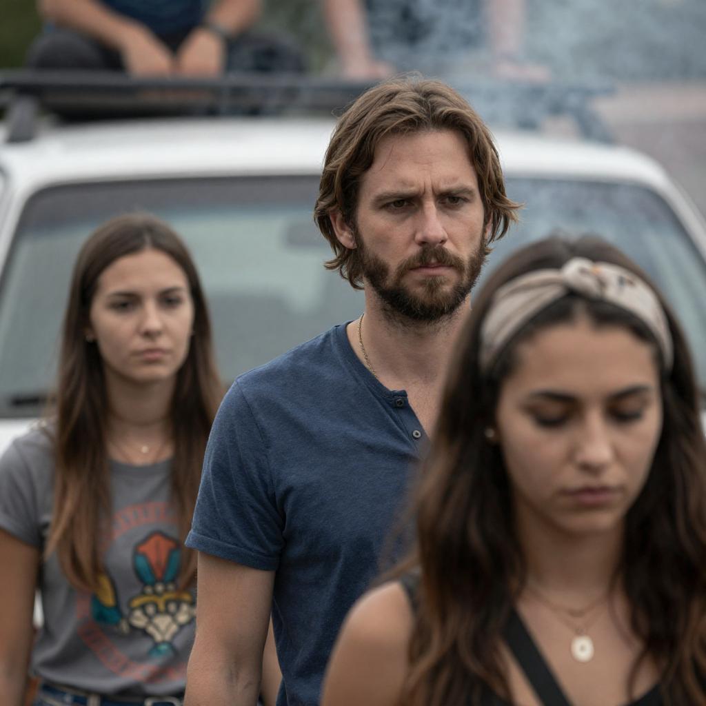 Three people stand under a tent-like structure engaged in a tense conversation. A bearded man with shoulder-length brown hair wearing a beige shirt faces an older man with gray hair dressed in a black polo shirt. A young woman with long brown hair, wearing a black t-shirt and jeans, stands behind them observing the interaction. The indoor setting has a blurred outdoor background.