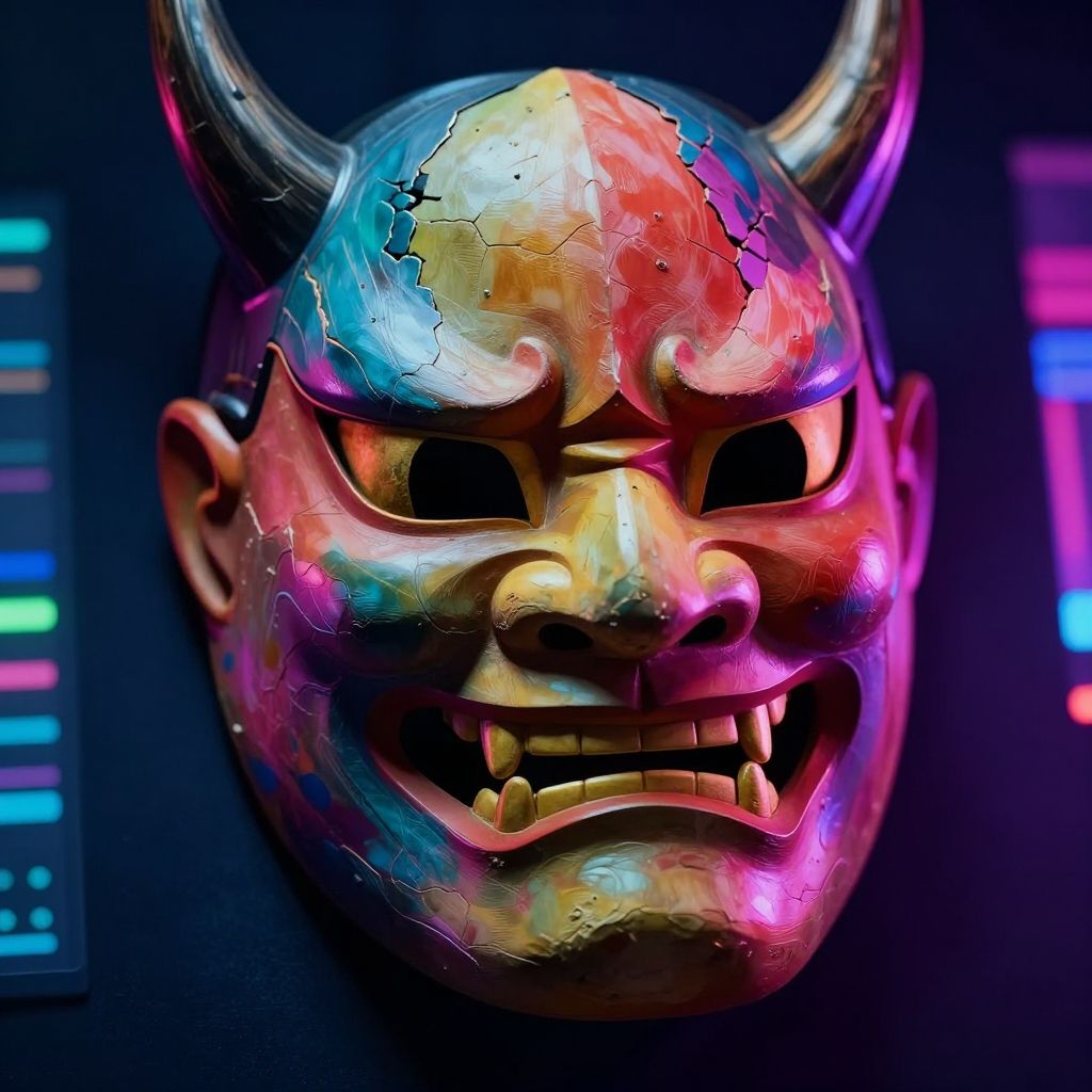 Vibrant, neon-colored, cracked, demonic mask with horns, sharp teeth, and fierce expression against a dark, futuristic background with glowing panels.