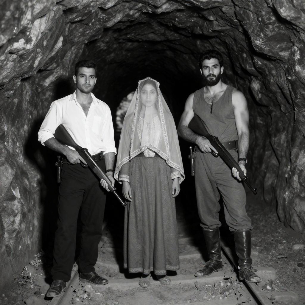 Black and white photograph of three people in a rocky, dimly lit tunnel. A man in a white shirt and dark pants stands on the left, holding a weapon. A woman with a veil and traditional clothing stands beside him. A muscular man with dark hair and a beard stands to the right, also holding a weapon. The tunnel has railway tracks and rough, ured walls. The man on the left has a serious expression. The woman's face is partially obscured by her veil.