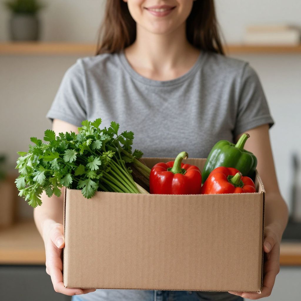 Woman holding a cardboard box filled with fresh vegetables, including green parsley, red bell peppers, and a green pepper, while smiling warmly in a cozy indoor setting.
