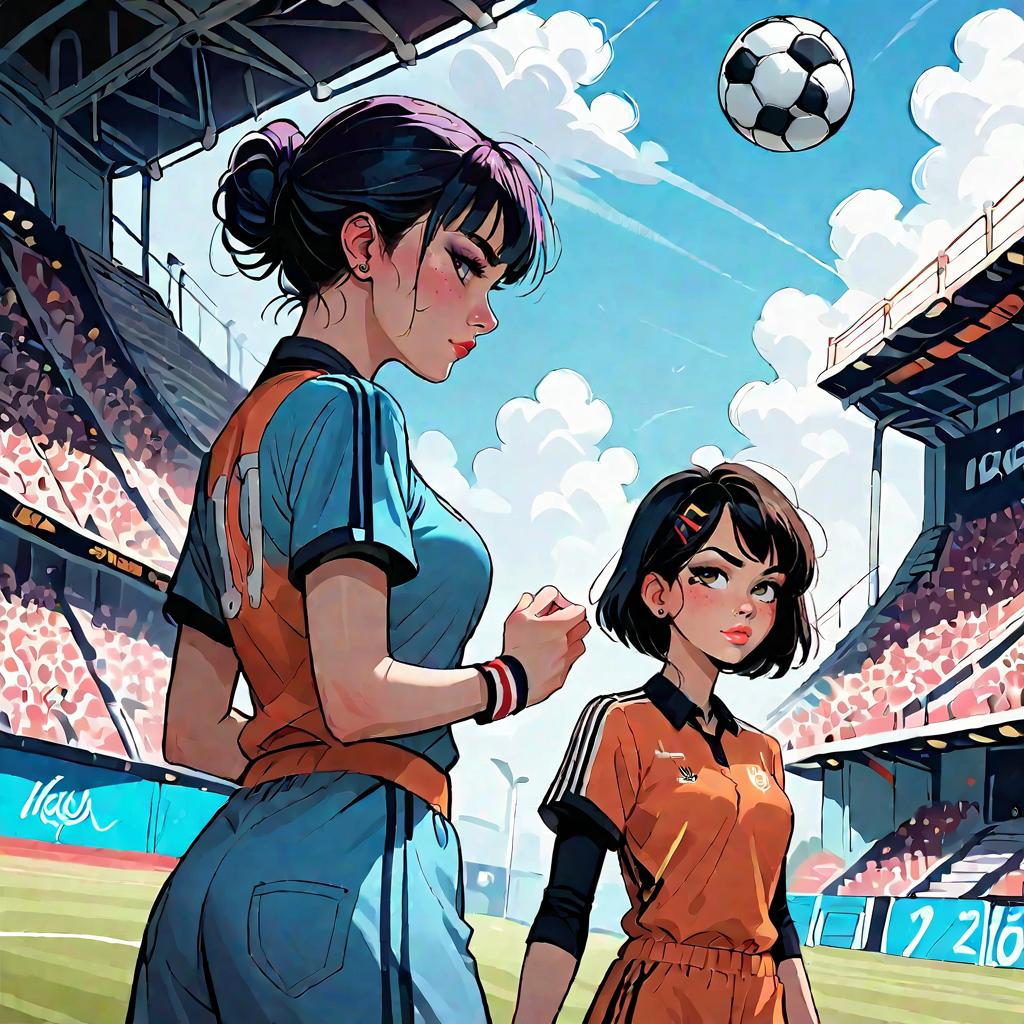 Score_9, score_8_up, score_7_up, score_6_up, source anime , anime screencap, two girls playing soccer, football, sport, medium breasts