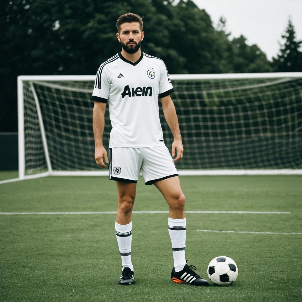 Odell beckham costume,1boy, solo, male focus, beard, sportswear, facial hair, shirt, realistic, sneakers, full body, standing, black hair, shoes, soccer, dark-skinned male