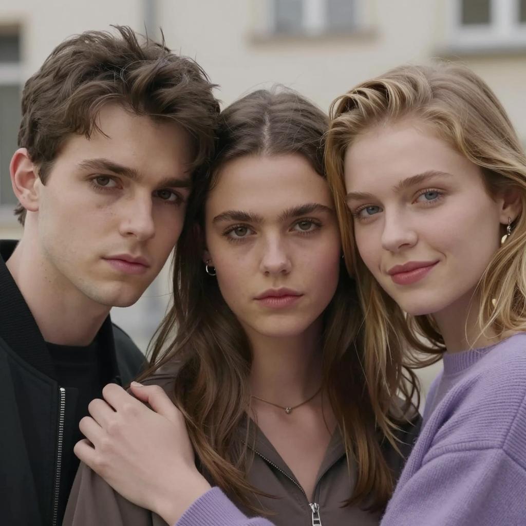 Four people. Blonde man in leather jacket, white shirt, center, looking forward. Dark-haired woman in blue jacket, right, leaning close, intense gaze. Man with brown hair, white shirt, right, brushing teeth, expression focused. Dark-skinned man with patterned jacket, left, partially obscured, serious expression. Blue background, indoor setting.