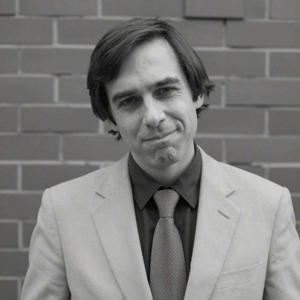Black and white photograph of a man with medium-length dark hair, light skin, and a slightly smug expression. He wears a light-colored suit jacket over a dark shirt with a patterned tie. He stands in front of a cracked brick wall. The background is blurry. The man is positioned slightly to the right.