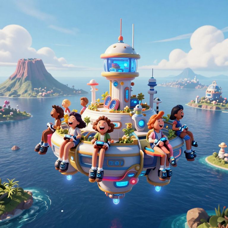 A vibrant, CGI digital illustration features six diverse, cartoon-style children with smiling faces, seated on a futuristic, floating island-like structure with a control tower. They wear casual, colorful clothes and sneakers. The structure has glowing blue lights and is adorned with small plants. The background showcases a clear, blue sky with fluffy white clouds, a large mountain on the left, and distant islands with white buildings. The water below reflects the bright sky and surrounding scenery. The overall style is playful and whimsical, with bright colors and a sense of adventure.