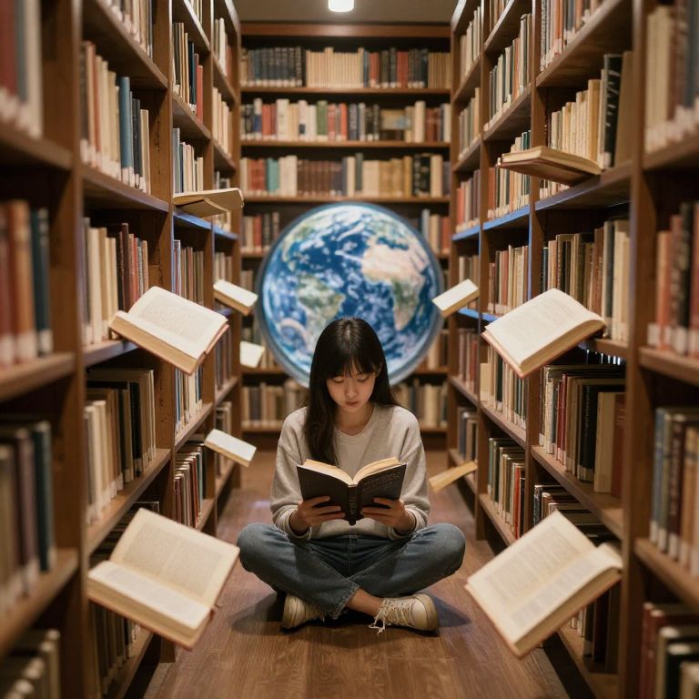 A library in which books open into portals to their fictional worlds, each reader momentarily transported upon turning the first page.