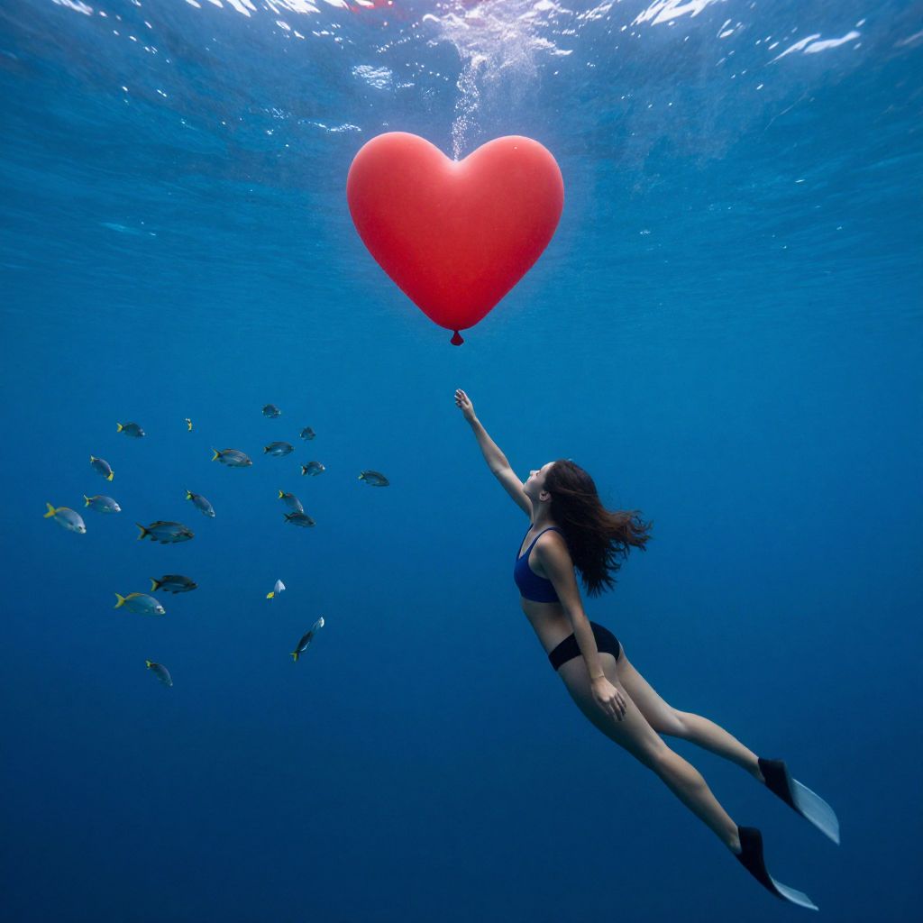 Under the tranquil blue depths, a woman reaches toward a luminous red heart-shaped balloon, as a school of fish gracefully orbits around it, defying the boundaries between human aspiration and aquatic wonder.
