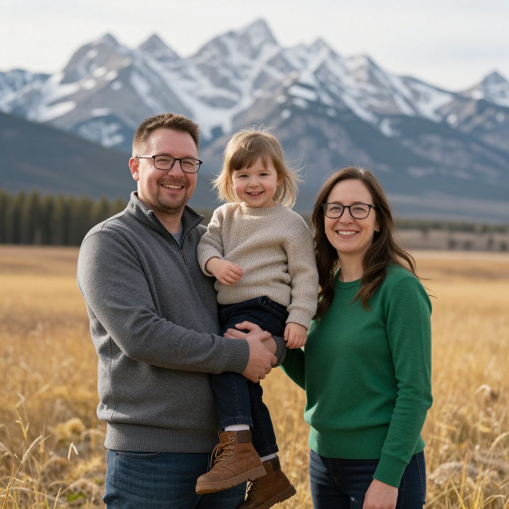Family portrait captures a joyful moment in Canmore, with three individuals—two adults and a child—standing together against a backdrop of majestic snow-capped mountains and a golden field. The man, wearing a gray zip-up sweater and glasses, holds the child, who is dressed in a beige sweater and dark pants, while the woman, in a green long-sleeve shirt and glasses, stands beside them, all smiling warmly.