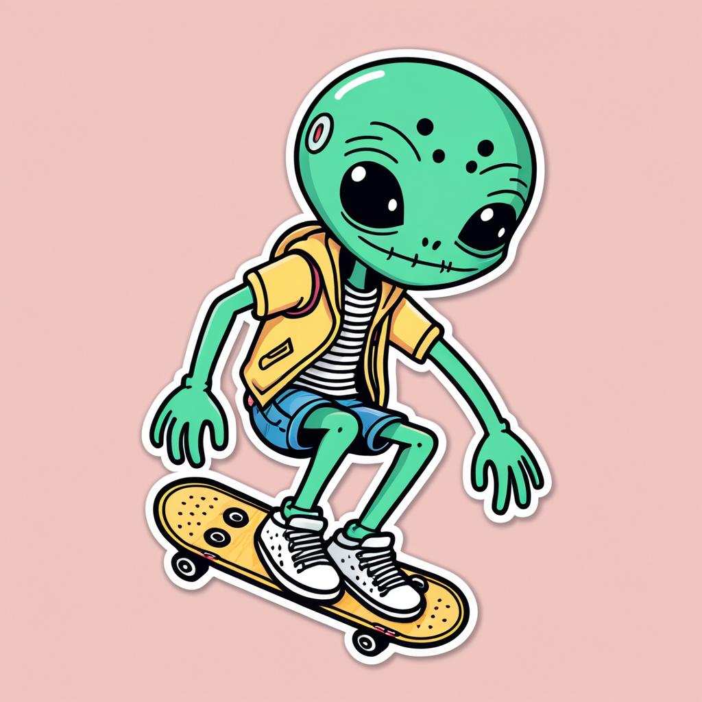 A alien riding a skateboard, illustrated as a die-cut sticker. Simple, clean vector line art, with flat colors and a pastel background. HDR, ultra-detailed, crisp outlines, cartoon aesthetic
