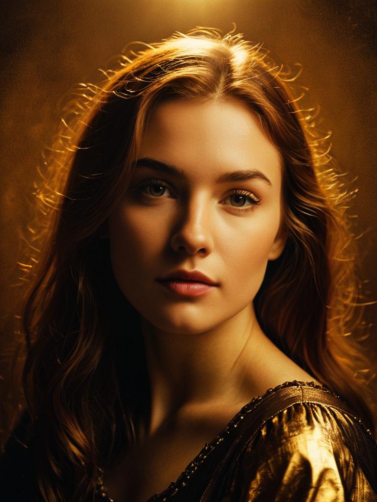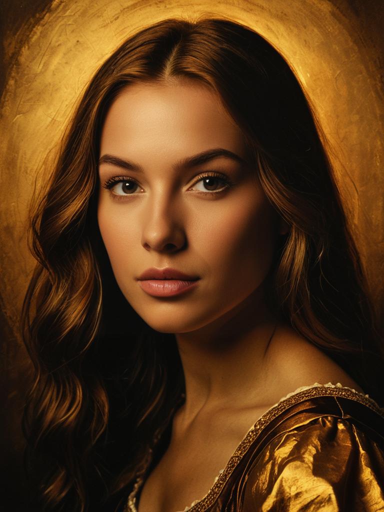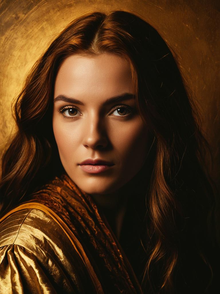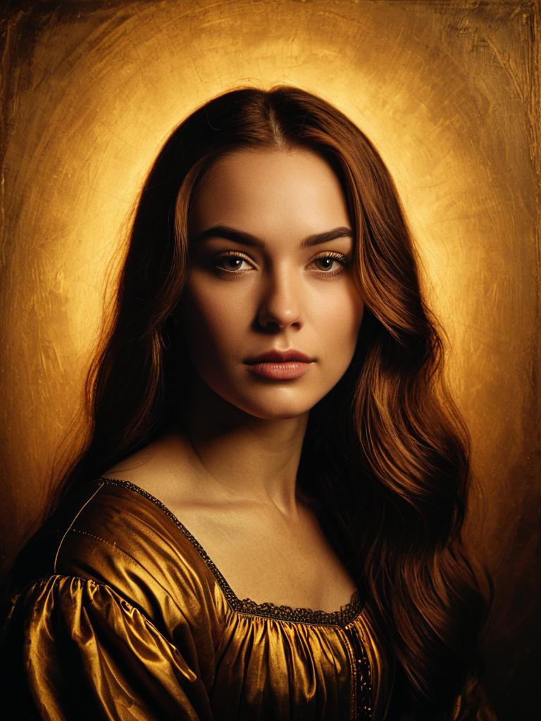 Close-up portrait of a young Caucasian woman with long auburn hair wearing a golden Renaissance-style dress. The image features warm lighting with a golden, textured background that enhances the historically inspired theme.