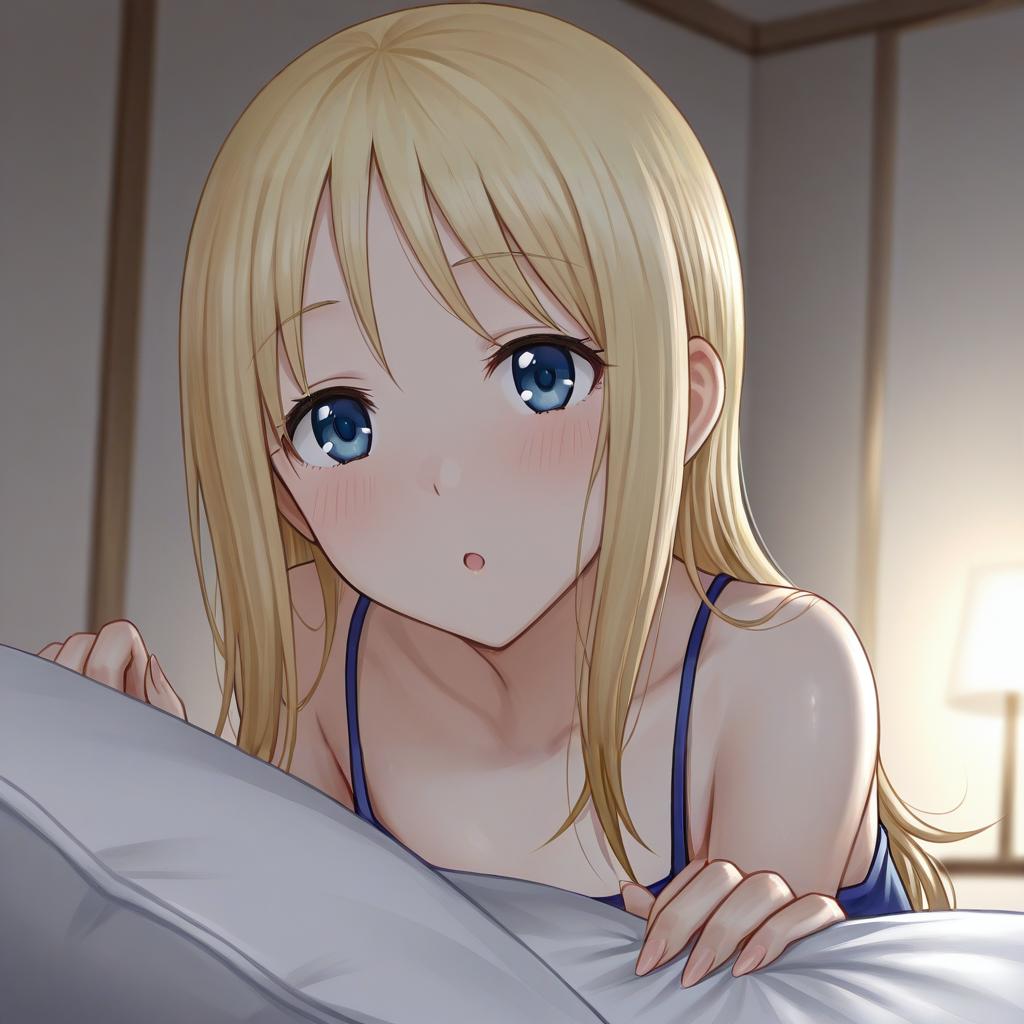 Close-up digital illustration of a blonde anime girl with long hair and blue eyes leaning over a pillow in a softly lit bedroom. She wears a blue sleeveless top and has a gentle, slightly surprised expression on her face. The background shows a blurred lamp and muted wall tones.