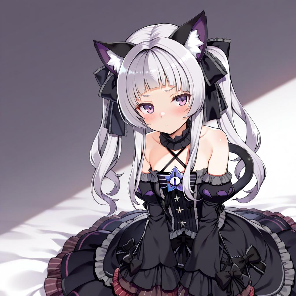 This digital anime-style illustration features a cute, young girl with long, white hair and purple eyes, adorned with black cat ears and matching black bows. She wears a gothic Lolita dress with black lace, frills, and star patterns, accentuated by a purple bow at the chest. Her skin is fair, and she has a shy expression. The background is a gradient of dark purple to white, with a bright white light source from the bottom right. Her hands are clasped in front, and she sits slightly hunched, adding to her innocent and delicate appearance.