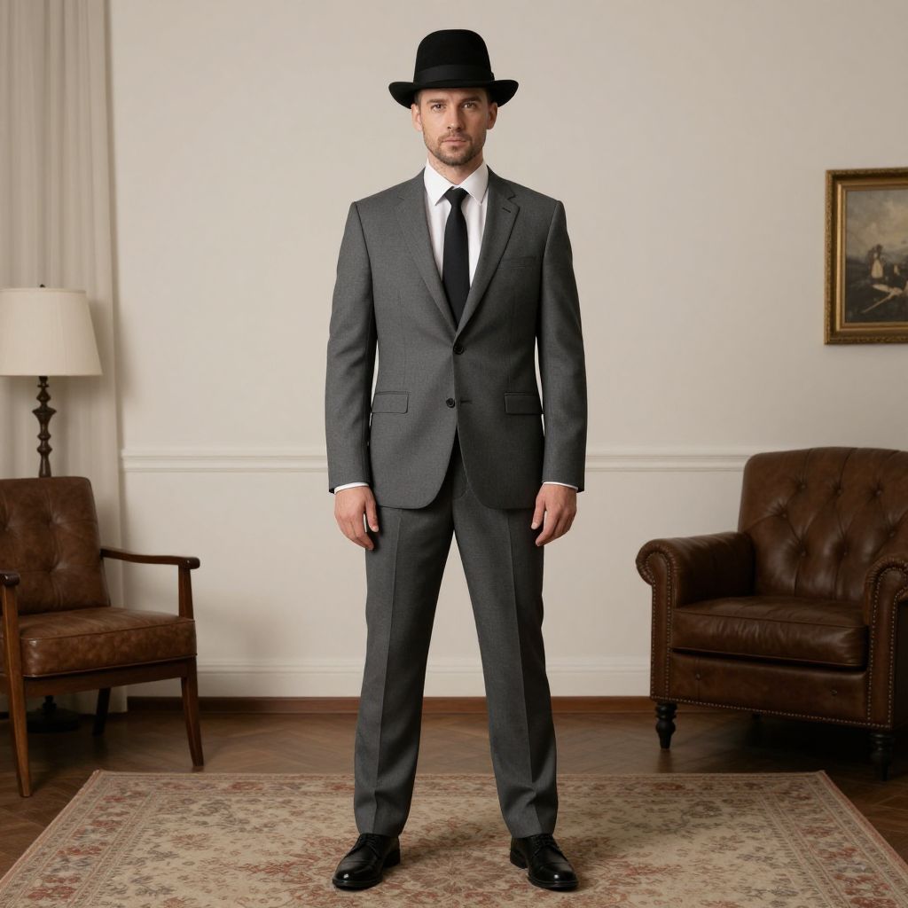 Jigsaw Costume Man, man in a suit and hat standing in a room